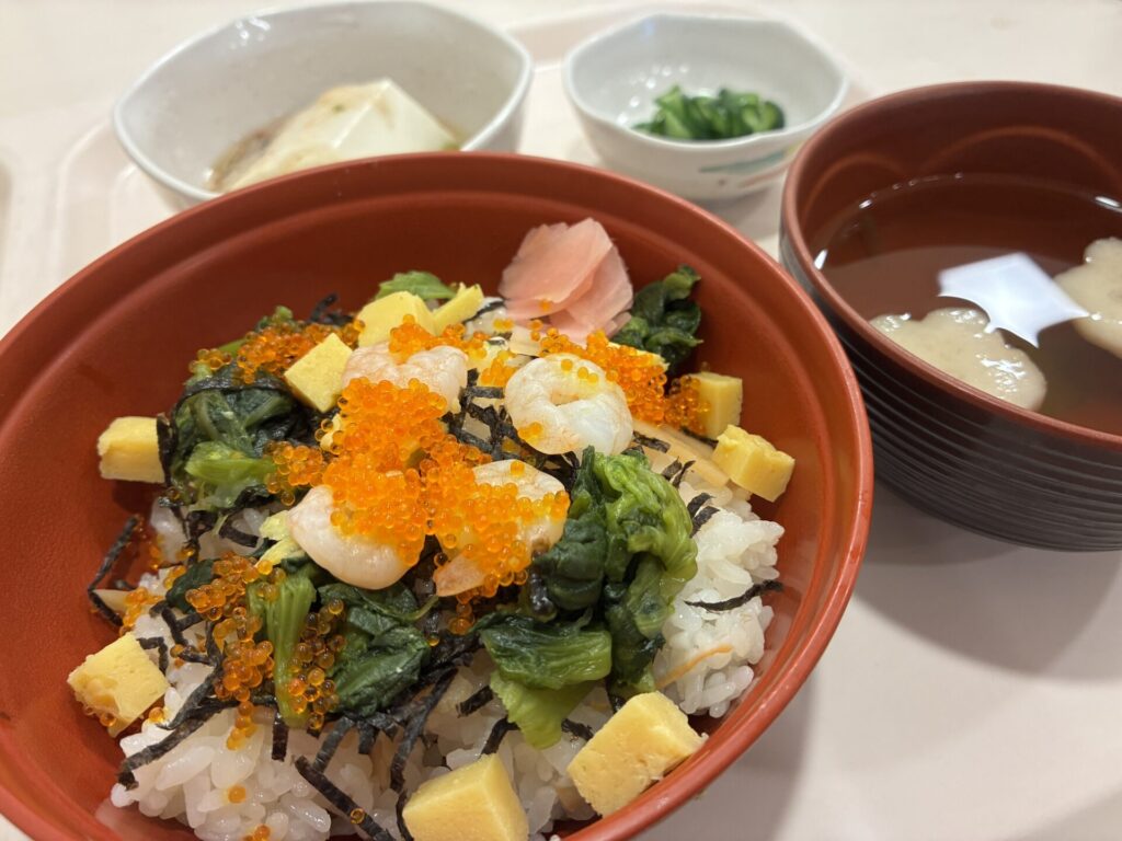 ひな祭りの献立です。行事に合わせた特別メニューをご用意し、季節の行事をお食事でも楽しんでいただいています。