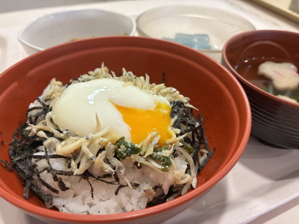 今回のお品書きは、たっぷりのしらすに温泉卵を添えた【特製しらす丼】です。